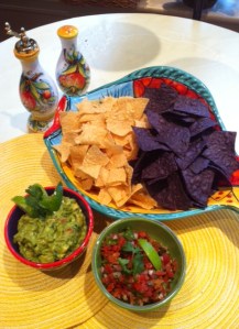 Get another nice bowl for the store bought tortilla chips. Serve them alongside the quac and salsa, and uncork the wine or pop the craft beer you bought.