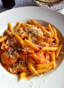 ACtually throwing pasta against a wall doesn’t work. I’ve seen you do it and your poor kitchen looks like a spider web. Best thing is to take piece out of the water and taste it. Firm to the tooth but not raw in the middle. For the amount of sauce in this recipe, a pound of shrimp is good and you add cream until it is a little lighter than red, not creamy. And drinking the wine in your case only makes you ‘in the sauce’ not cooking the sauce. Ha Ha