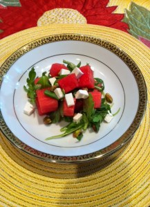 So what does Watermelon and Chili Oil have to do with all this? Well, let me ask this: would you have ever guessed watermelon and chili oil could ever be companions in a salad? No, me either. But this Odd Combination is not only compatible, buy they do a fantastic dance together in a salad with Arugula, Pistachios and Goat Cheese!